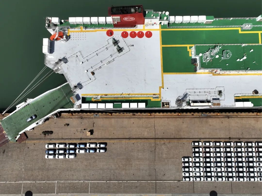 2024年4月25日,江蘇連云港,2020輛比亞迪新能源汽車出口至巴西,刷新了該港新能源車單船出口紀(jì)錄。