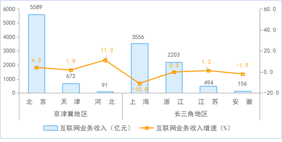 京津冀地區(qū)互聯(lián)網(wǎng)業(yè)務收入穩(wěn)步增長。京津冀地區(qū)完成互聯(lián)網(wǎng)業(yè)務收入6352億元,同比增長4.1%,占全國互聯(lián)網(wǎng)業(yè)務收入的35.2%。長三角地區(qū)完成互聯(lián)網(wǎng)業(yè)務收入6409億元,同比下降6.3%,占全國互聯(lián)網(wǎng)業(yè)務收入的35.5%。