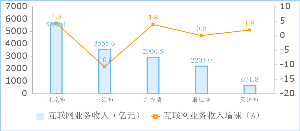 近半數(shù)地區(qū)互聯(lián)網(wǎng)業(yè)務收入實現(xiàn)正增長?;ヂ?lián)網(wǎng)業(yè)務累計收入居前5名的北京(增長4.3%)、上海(下降10.8%)、廣東(增長3.8%)、浙江(基本持平)和天津(增長1.9%)共完成業(yè)務收入14920億元,同比下降0.6%,占全國(扣除跨地區(qū)企業(yè))互聯(lián)網(wǎng)業(yè)務收入的82.7%。全國互聯(lián)網(wǎng)業(yè)務收入實現(xiàn)正增長的省(區(qū)、市)有13個,其中云南、甘肅增速超80%。