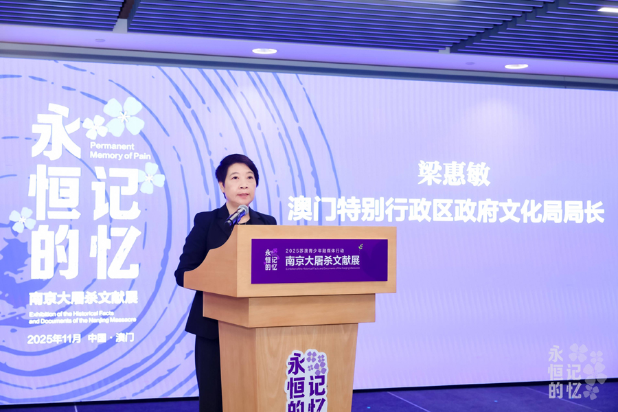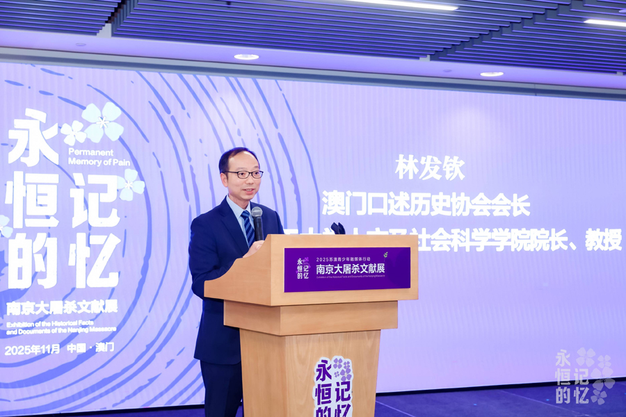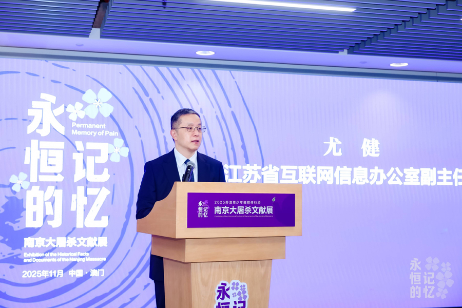 江蘇省互聯(lián)網(wǎng)信息辦公室副主任尤健在致辭中表示,此次“永恒的記憶”南京大屠殺文獻(xiàn)展落地澳門,旨在全方位、立體化地呈現(xiàn)歷史真相,教育引導(dǎo)澳門青少年群體厚植家國情懷,在新時代唱響愛國愛澳主旋律。尤健指出,“希望蘇澳兩地以展覽為平臺,讓歷史記憶啟明未來;以傳播為紐帶,讓抗戰(zhàn)精神薪火相傳;以文化為橋梁,讓愛國主義熠熠生輝?!弊?022年以來,“少年志·中國心·向未來”蘇澳青少年融媒體行動已經(jīng)第四次走進(jìn)澳門,尤健表示,此次展覽的落地將進(jìn)一步激發(fā)澳門同胞賡續(xù)愛國、團(tuán)結(jié)、奮斗傳統(tǒng),始終與祖國同頻共振,在建設(shè)強(qiáng)大祖國和美好澳門的廣闊天地中綻放光彩。