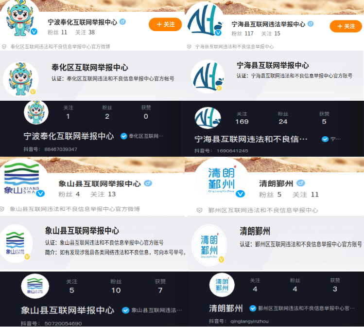 今年2月份以來(lái),寧波市委網(wǎng)信辦啟動(dòng)官方舉報(bào)賬號(hào)矩陣建設(shè)工作,通過(guò)對(duì)10個(gè)區(qū)(縣、市)級(jí)舉報(bào)中心走訪調(diào)研,廣泛吸收聽(tīng)取意見(jiàn)建議,擬定下發(fā)官方舉報(bào)賬號(hào)建設(shè)實(shí)施方案,明確以微博、抖音、今日頭條三大平臺(tái)為主其余多平臺(tái)為輔的建設(shè)方案,確定該批官方舉報(bào)賬號(hào)主要工作任務(wù)、考核獎(jiǎng)勵(lì)標(biāo)準(zhǔn)等。截至6月,市本級(jí)及10個(gè)區(qū)(縣、市)級(jí)三大平臺(tái)官方舉報(bào)賬號(hào)已全部開(kāi)設(shè)認(rèn)證完畢。