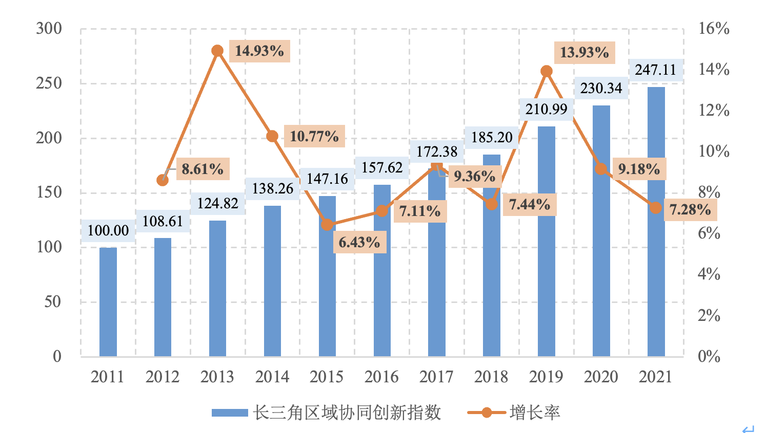 圖1 2011-2021年長三角區(qū)域協(xié)同創(chuàng)新總指數(shù)發(fā)展情況
