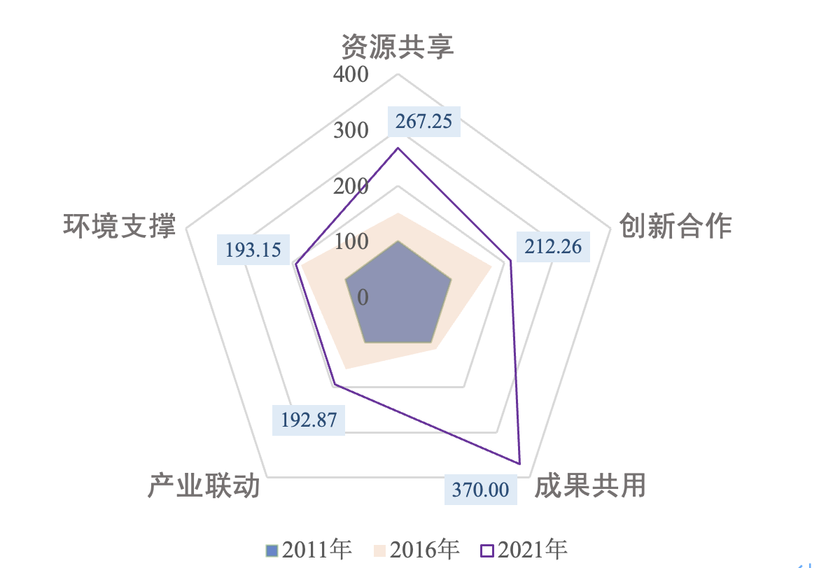 報(bào)告顯示,長三角區(qū)域協(xié)同創(chuàng)新指數(shù)從2011年的100分(基期)增長至2021年的247.11分,較2011年增長了近1.5倍,年均增速達(dá)到9.47%,長三角科技創(chuàng)新一體化能力顯著提升,推動(dòng)高水平科技自立自強(qiáng)。從5項(xiàng)一級指標(biāo)變化情況來看,成果共用指標(biāo)增幅最大,從2011年的100分提高到2021年的370.00分,年均增速達(dá)到13.98%;其次是資源共享指標(biāo),從2011年的100分上升到2021年的267.25分,年均增速達(dá)到10.33%;第三是創(chuàng)新合作指標(biāo),從2011年的100分增長到2021年的212.26分,年均增速達(dá)到7.82%;相對而言,產(chǎn)業(yè)聯(lián)動(dòng)和環(huán)境支撐兩個(gè)指標(biāo)發(fā)展增速稍顯緩慢,當(dāng)前和未來需要不斷探索長三角產(chǎn)業(yè)協(xié)同發(fā)展新路徑,營造區(qū)域一體化的科技創(chuàng)新環(huán)境。