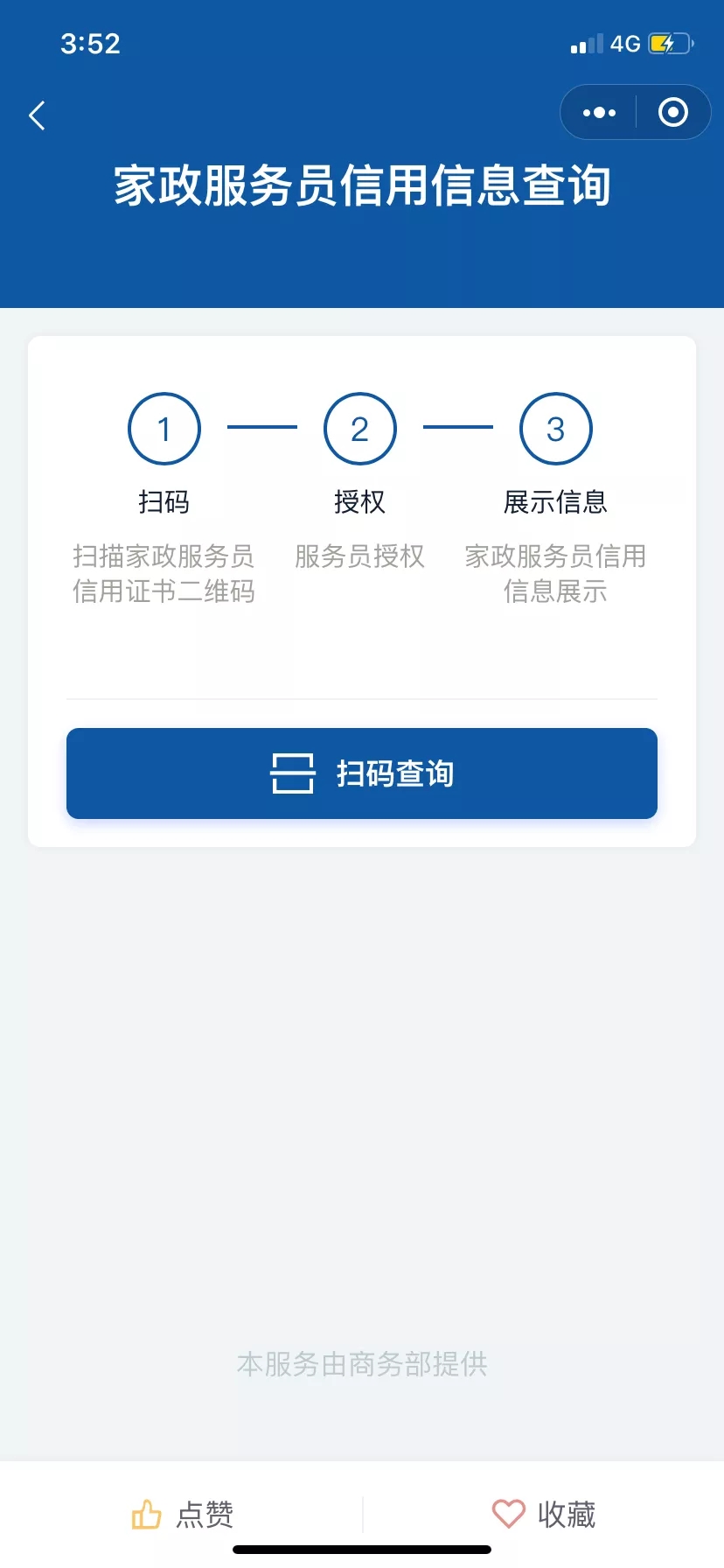 用戶(hù)掃描家政服務(wù)員信用證書(shū)二維碼,經(jīng)服務(wù)員授權(quán),即可展示家政服務(wù)員相關(guān)信息。