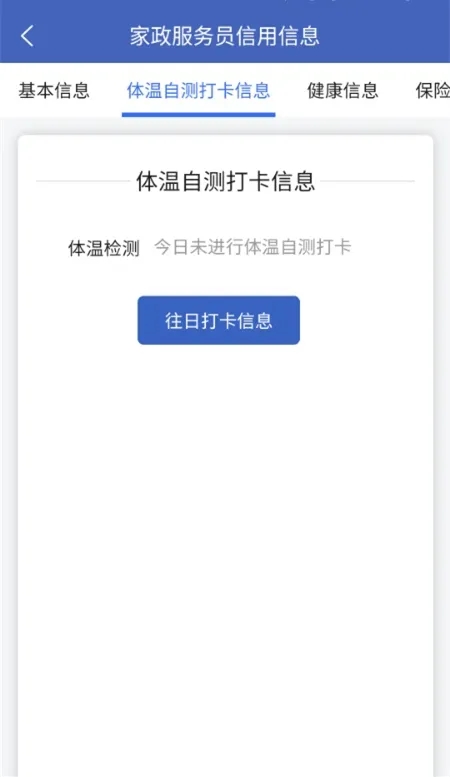 選擇需要查詢(xún)的信息。可查信息包括基本信息、體溫自測(cè)打卡信息、健康信息、保險(xiǎn)信息、從業(yè)信息和培訓(xùn)信息。