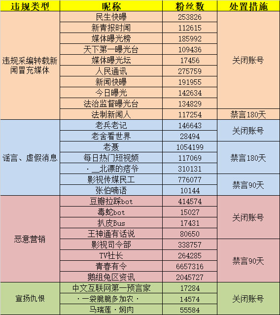 微博專項整治處置結(jié)果公告中稱,按照國家和北京市網(wǎng)信辦關(guān)于全面部署加強(qiáng)“自媒體”規(guī)范管理工作的通知要求。微博開展整治平臺和自媒體賬號突出問題規(guī)范網(wǎng)絡(luò)傳播秩序?qū)m椥袆拥陌才?,站方將集中對平臺內(nèi)存在的發(fā)布違規(guī)采編轉(zhuǎn)載互聯(lián)網(wǎng)新聞信息、散播虛假信息、宣揚仇恨、散布極端觀點惡意營銷的賬號進(jìn)行集中檢查清理。