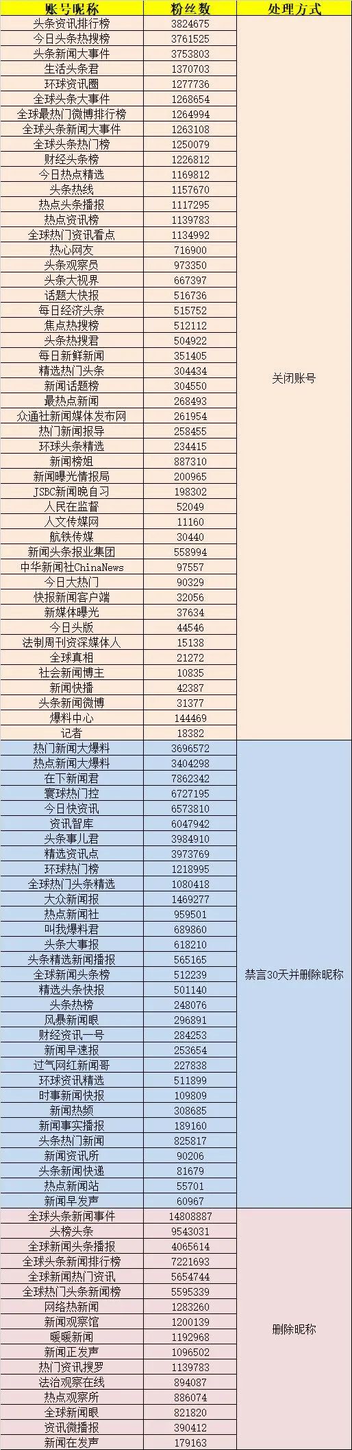 此次公示第三批違規(guī)賬號,共關閉、禁言、刪除昵稱賬號104007個,其中百萬粉絲以上的37個,一百萬粉絲到十萬粉絲的40個,十萬粉絲到一萬粉絲的18個。(附圖為被處置的頭部賬號名單)