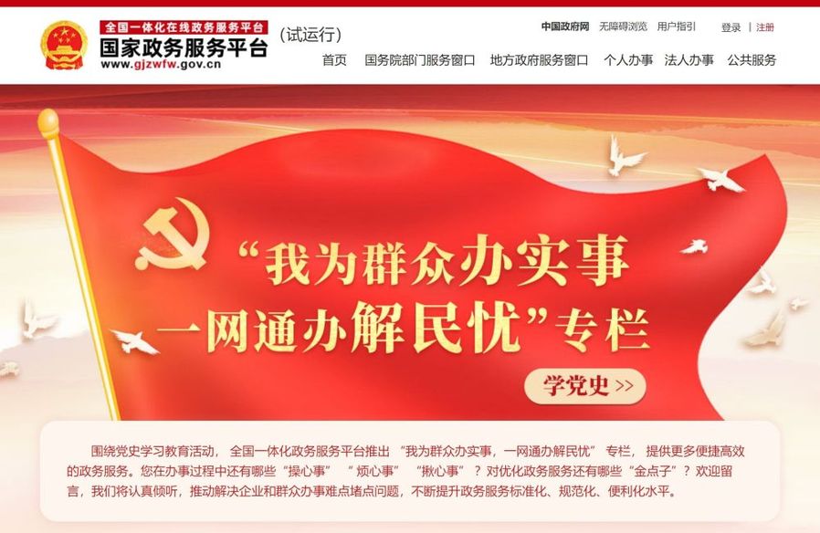 圍繞黨史學(xué)習(xí)教育,國家政務(wù)服務(wù)平臺近日推出“我為群眾辦實事,一網(wǎng)通辦解民憂”專欄。企業(yè)和群眾在辦事過程中如果遇到“煩心事”,或者有優(yōu)化政務(wù)服務(wù)的“金點子”,都可在專欄“說說心里話”。平臺將認真傾聽,推動解決企業(yè)和群眾辦事難點堵點問題,不斷提升政務(wù)服務(wù)標(biāo)準化、規(guī)范化、便利化水平。