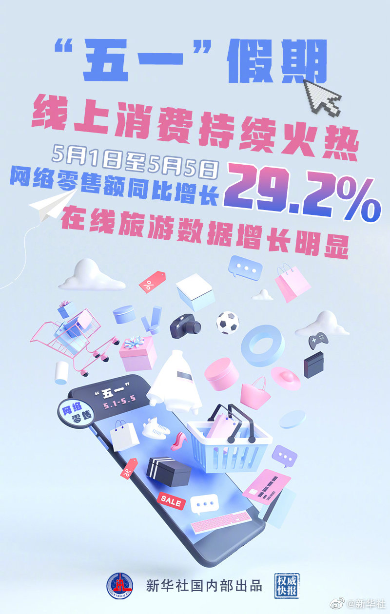 商務部6日發(fā)布的數(shù)據(jù)顯示,“雙品網(wǎng)購節(jié)”前8天(4月28日至5月5日),線上消費提質(zhì)升級效果明顯:全國網(wǎng)絡零售額達到3818億元,同比增長28.1%。在網(wǎng)購節(jié)帶動下,“五一”假期,網(wǎng)絡零售額同比增長29.2%。五一在線旅游增長迅速:零售額同比大幅增長371.2%,國內(nèi)線上旅游產(chǎn)品和景點門票銷售額同比分別增長526.3%和 300.7%;高品質(zhì)出游則成新趨勢,私家團游、親子游、紅色游同比分別增長超10倍、7倍和2倍;在線餐飲“緊隨其后”,零售額同比增長56.7%,在外地出游和親朋聚餐推動下,在線餐飲到店銷售額同比增長272.3%。(記者鄒多為、于佳欣,海報設計苗夏陽)