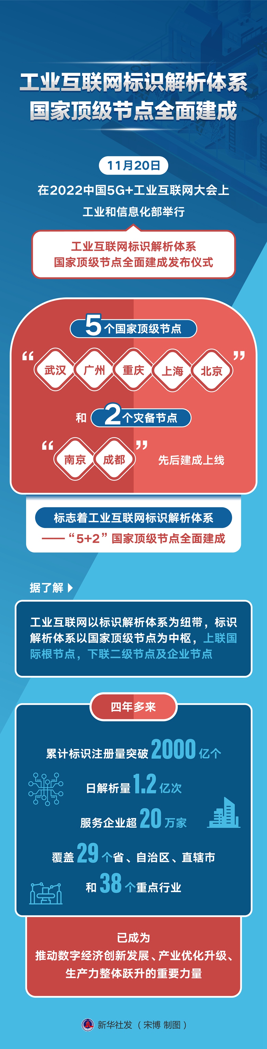 新華社武漢11月20日電(記者 徐海波 龔聯(lián)康)20日,在2022中國5G+工業(yè)互聯(lián)網(wǎng)大會上,工業(yè)和信息化部舉行工業(yè)互聯(lián)網(wǎng)標識解析體系國家頂級節(jié)點全面建成發(fā)布儀式,標志著工業(yè)互聯(lián)網(wǎng)標識解析體系——“5+2”國家頂級節(jié)點全面建成。
