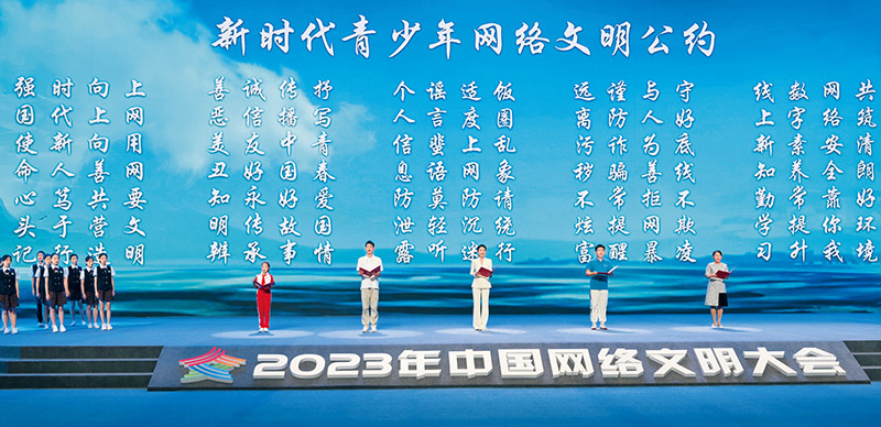 黨的十八大以來,習近平總書記圍繞加強網(wǎng)絡文明建設、共建網(wǎng)上美好精神家園發(fā)表一系列重要論述,深刻揭示了網(wǎng)絡文明建設的規(guī)律。圖為2023年7月18日,在福建省廈門市舉行的2023年中國網(wǎng)絡文明大會主論壇發(fā)布《新時代青少年網(wǎng)絡文明公約》。 新華社記者 林善傳/攝