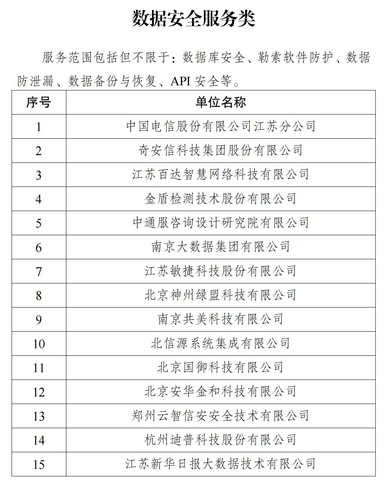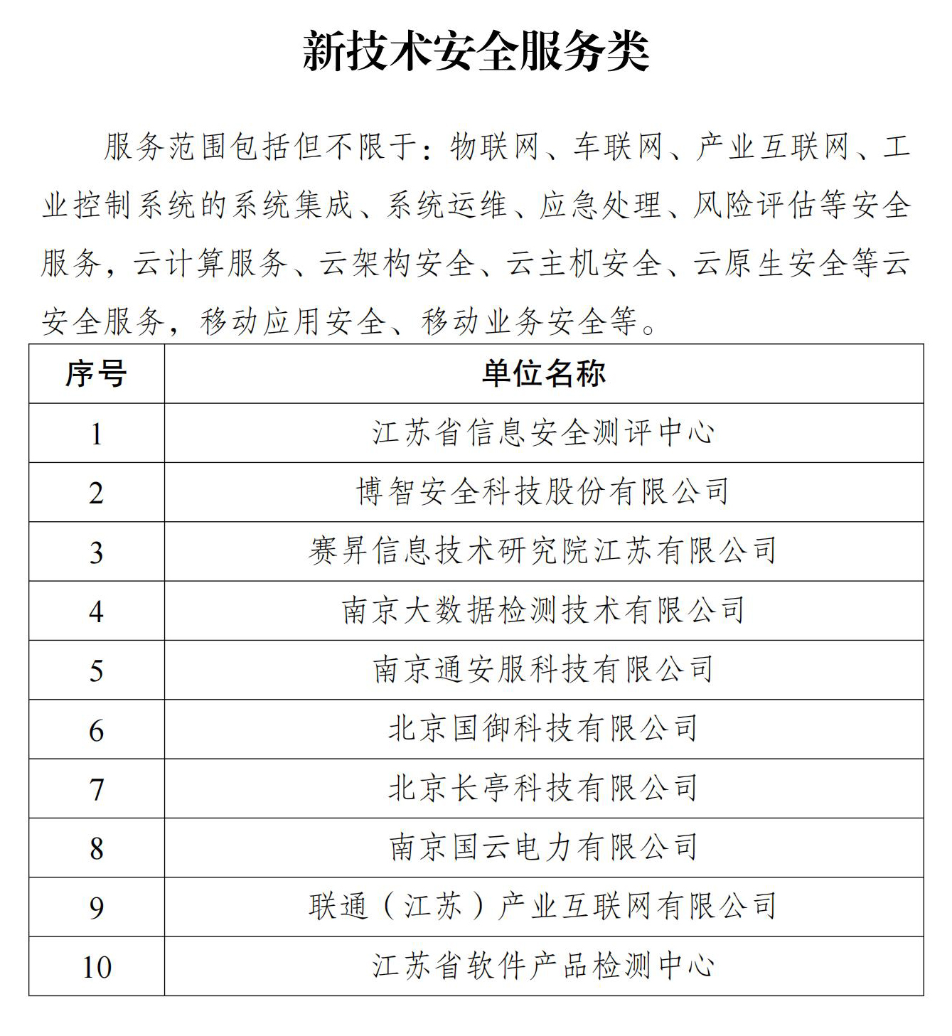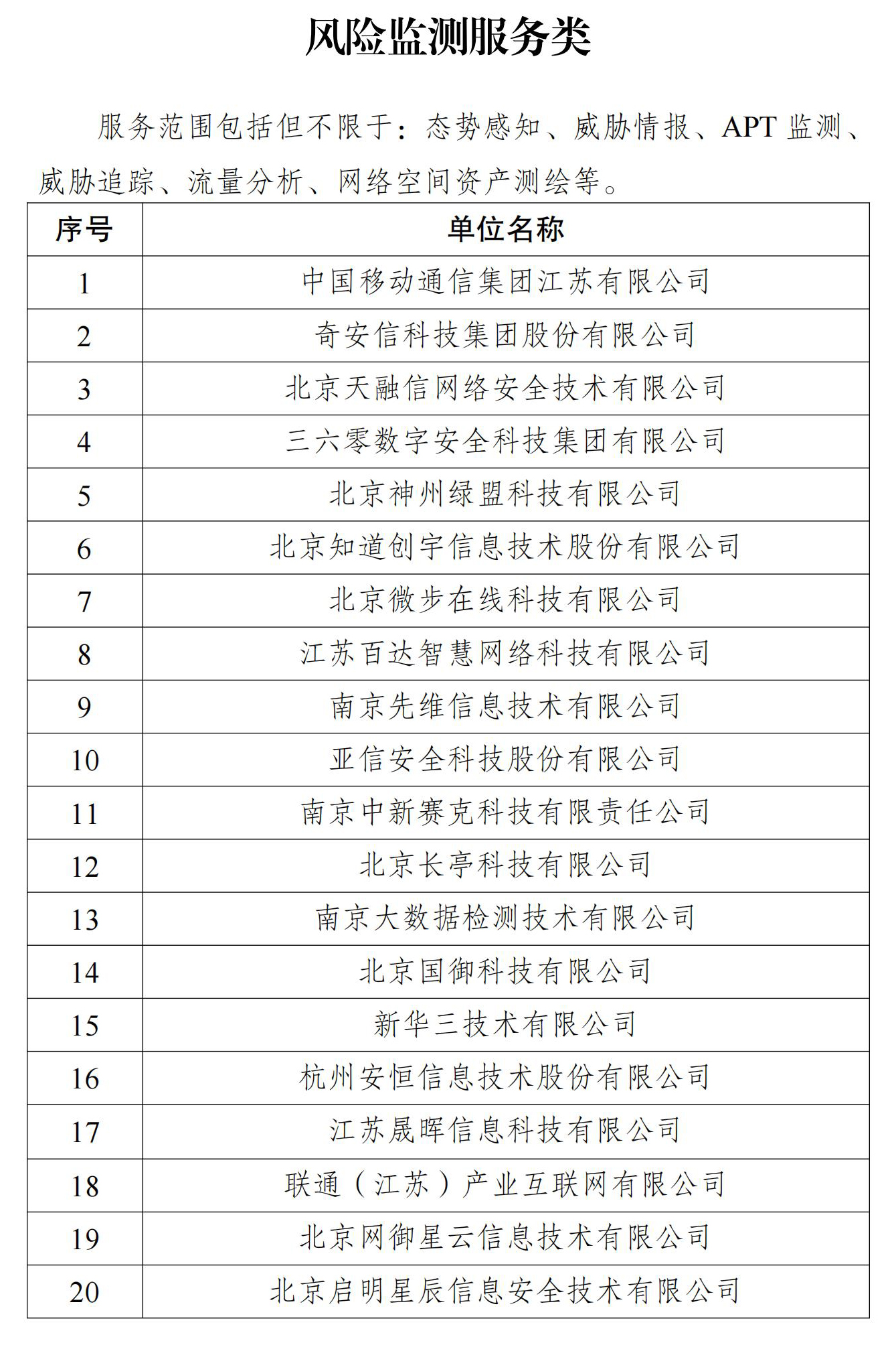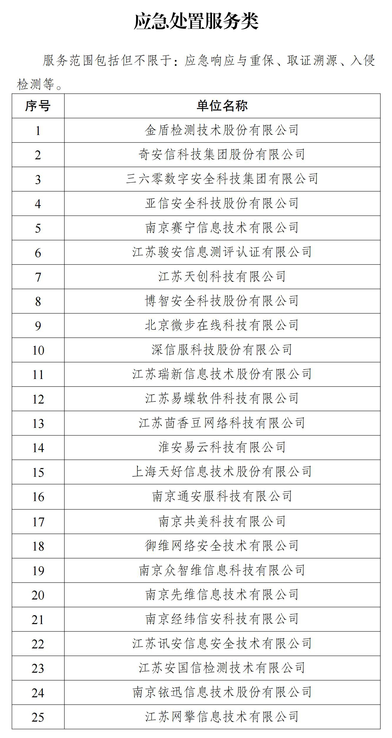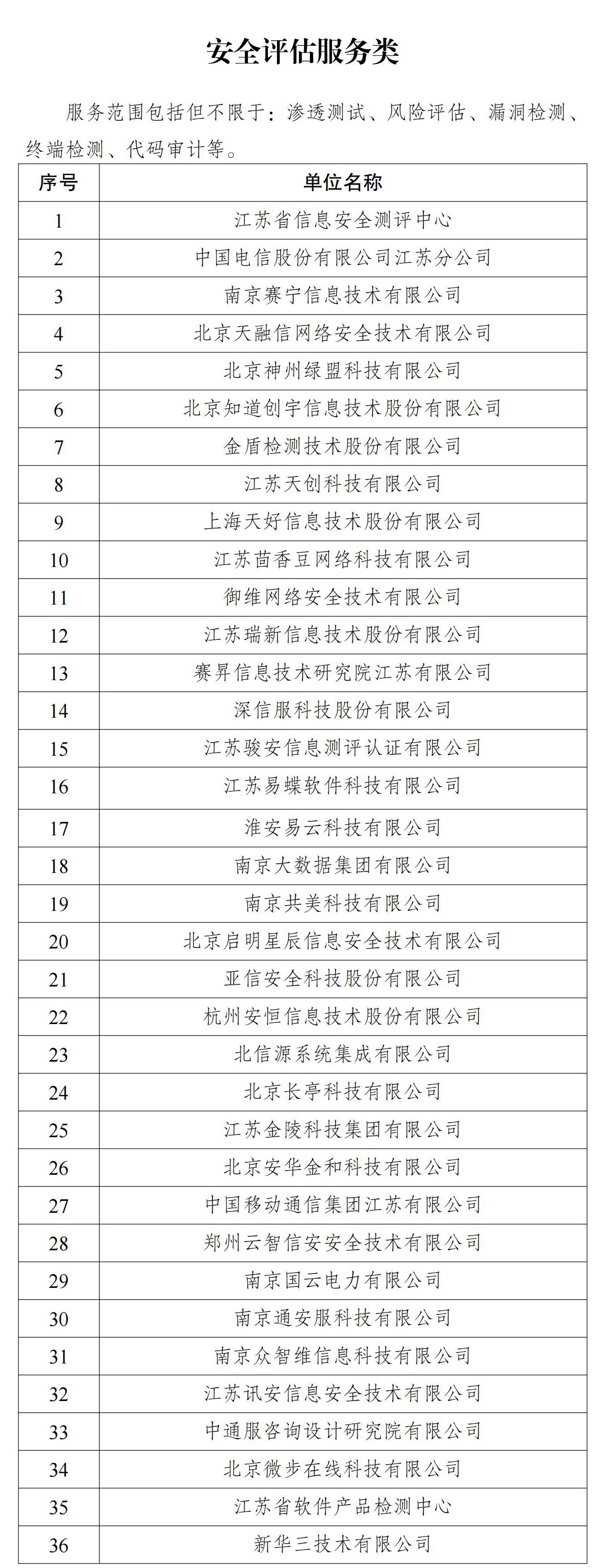 根據(jù)中共江蘇省委網(wǎng)絡(luò)安全和信息化委員會辦公室《關(guān)于開展2024年度江蘇省網(wǎng)絡(luò)安全服務(wù)資源池申報工作的通知》,經(jīng)自主申報、形式審查、專家評審和綜合評定等環(huán)節(jié),擬選取以下6類共54家單位進(jìn)入2024年度江蘇省網(wǎng)絡(luò)安全服務(wù)資源池。