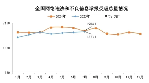 2025年7月,中央網(wǎng)信辦舉報(bào)中心指導(dǎo)全國(guó)各級(jí)網(wǎng)信舉報(bào)工作部門(mén)、主要網(wǎng)站平臺(tái)受理網(wǎng)民舉報(bào)色情、賭博、侵權(quán)、謠言等違法和不良信息1873.1萬(wàn)件,環(huán)比增長(zhǎng)1.3%、同比下降1.6%。其中,中央網(wǎng)信辦舉報(bào)中心受理舉報(bào)51.6萬(wàn)件,環(huán)比增長(zhǎng)29.5%、同比增長(zhǎng)21.3%;各地網(wǎng)信舉報(bào)工作部門(mén)受理舉報(bào)62.1萬(wàn)件,環(huán)比下降2.4%、同比下降39.7%;全國(guó)主要網(wǎng)站平臺(tái)受理舉報(bào)1759.5萬(wàn)件,環(huán)比增長(zhǎng)0.8%,同比增長(zhǎng)0.04%。