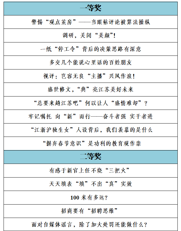 由中共江蘇省委網(wǎng)信辦、江蘇省新聞工作者協(xié)會聯(lián)合組織開展的第二屆紫金網(wǎng)絡(luò)評論大賽已完成評選工作。經(jīng)研究,現(xiàn)對擬確定的一、二、三等獎、優(yōu)秀獎和優(yōu)秀組織獎進(jìn)行公示。公示時間為2023年12月29日至2024年1月8日。如對公示名單有異議,請在公示期內(nèi)向省委網(wǎng)信辦網(wǎng)絡(luò)傳播處反映。聯(lián)系電話:025—86292753;025—58683929。
