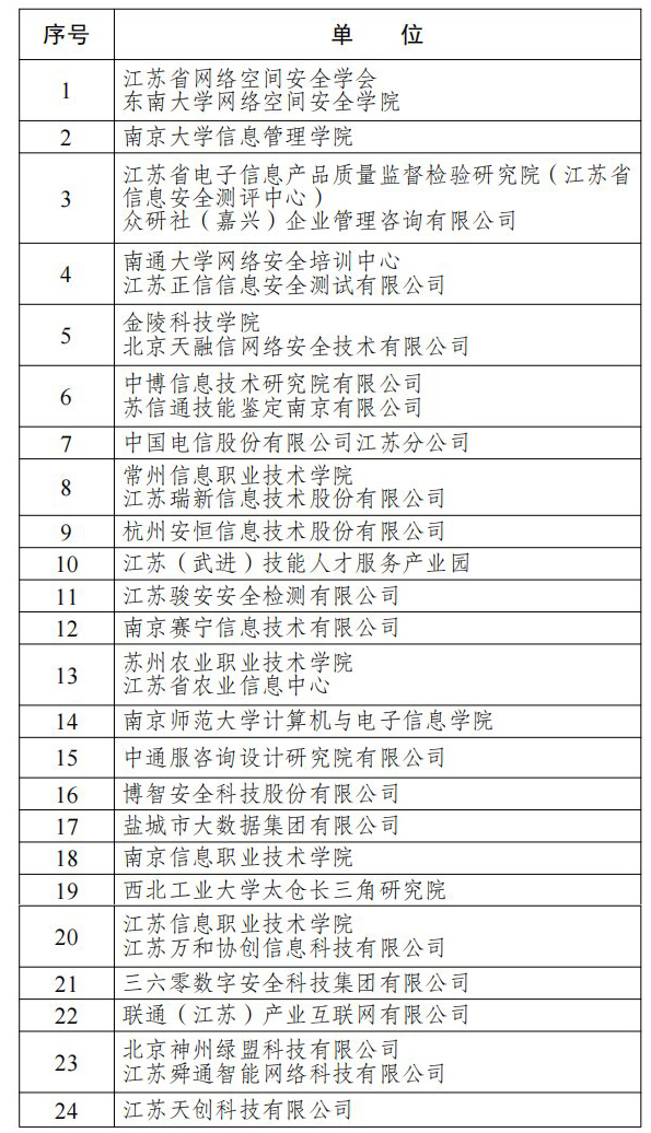 經(jīng)自主申報(bào)、形式審查、專(zhuān)家評(píng)審和綜合評(píng)定等環(huán)節(jié),選取以下24家單位(聯(lián)合體)作為首批次江蘇省網(wǎng)絡(luò)安全培訓(xùn)服務(wù)資源池入池單位(排名不分先后):