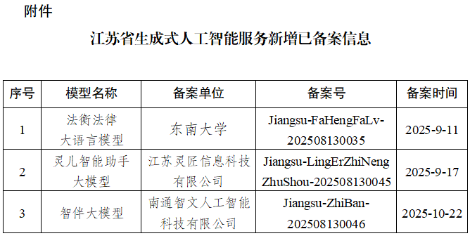 ◆江蘇省生成式人工智能服務(wù)已備案(登記)信息公告(2025年7月25日)