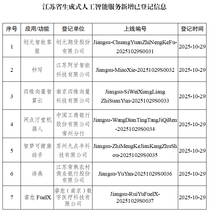 附件:江蘇省生成式人工智能服務(wù)新增已備案(登記)信息