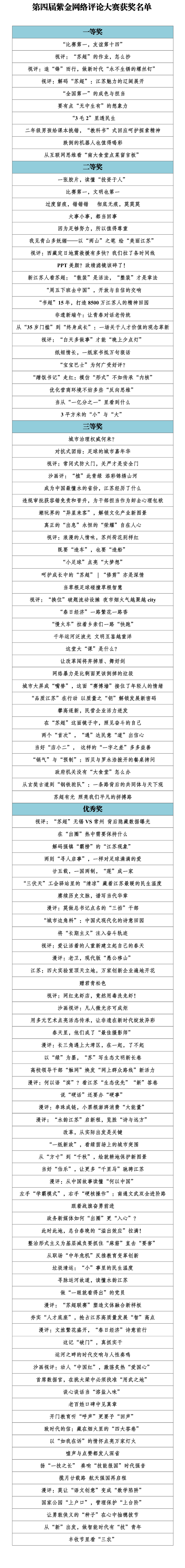 第四屆紫金網(wǎng)絡(luò)評(píng)論大賽由中共江蘇省委網(wǎng)信辦、江蘇省新聞工作者協(xié)會(huì)聯(lián)合舉辦,經(jīng)前期申報(bào)、推薦和專家遴選,現(xiàn)將擬確定的一、二、三等獎(jiǎng)及優(yōu)秀獎(jiǎng)進(jìn)行公示。公示時(shí)間為2025年12月31日至2026年1月7日。如對(duì)公示名單有異議,請(qǐng)?jiān)诠酒趦?nèi)向省委網(wǎng)信辦網(wǎng)絡(luò)傳播處反映。聯(lián)系電話:025—86292753,18120145350。