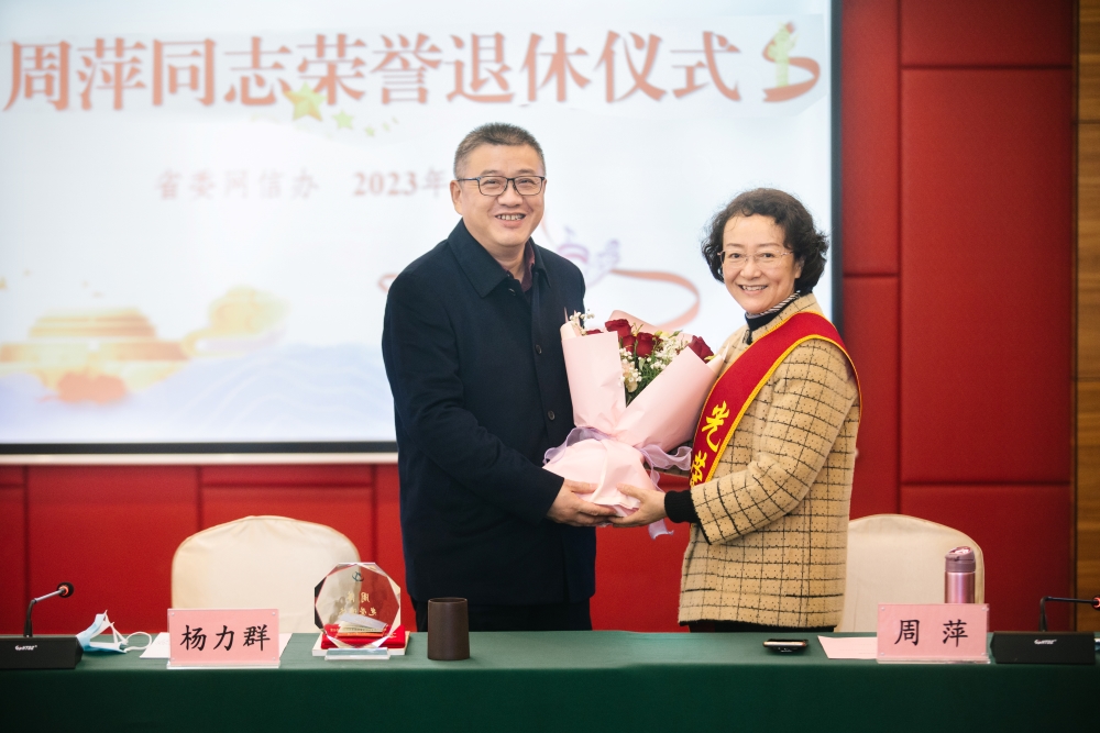 榮退儀式上,省委宣傳部副部長、省委網(wǎng)信辦主任楊力群為退休干部周萍同志送上鮮花,并頒發(fā)退休證和榮譽證。楊力群同志代表辦務(wù)會向周萍同志長期以來的辛勤付出致以衷心感謝,對周萍同志光榮退休表達了美好祝福。他表示,周萍同志長期奮戰(zhàn)在信息化條線,勤勤懇懇、愛崗敬業(yè),為網(wǎng)信事業(yè)發(fā)展付出了大量心血、作出了重要貢獻。希望周萍同志退休后安享生活,并繼續(xù)發(fā)揮經(jīng)驗豐富的優(yōu)勢,一如既往地關(guān)心和支持網(wǎng)信事業(yè)發(fā)展。