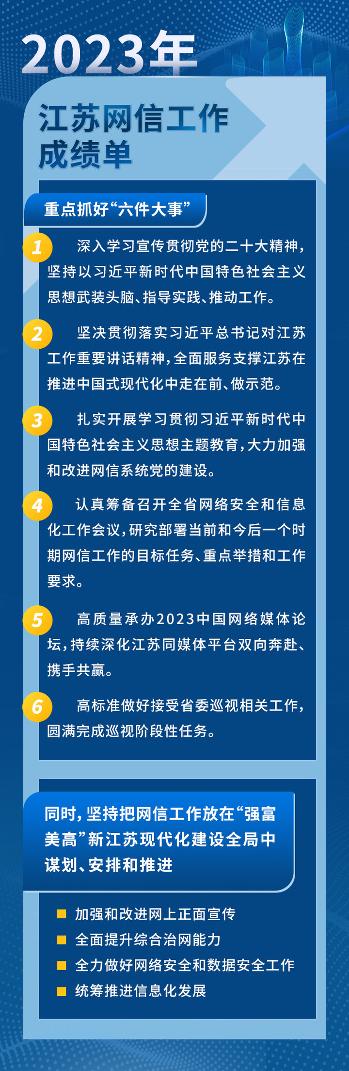 會議首先亮出2023年江蘇網(wǎng)信工作成績單。這一年,在省委堅強(qiáng)領(lǐng)導(dǎo)下,全省網(wǎng)信系統(tǒng)堅持把深入學(xué)習(xí)宣傳貫徹黨的二十大精神、習(xí)近平總書記對江蘇工作重要講話重要指示精神和開展學(xué)習(xí)貫徹習(xí)近平新時代中國特色社會主義思想主題教育,作為貫穿全年工作的主題主線,一體謀劃、一體部署、一體推進(jìn)。認(rèn)真貫徹落實全國全省宣傳思想文化工作會議、網(wǎng)信工作會議精神,在加強(qiáng)網(wǎng)絡(luò)內(nèi)容建設(shè)與管理、筑牢網(wǎng)絡(luò)安全屏障、發(fā)揮信息化驅(qū)動引領(lǐng)作用、強(qiáng)化黨的建設(shè)和干部隊伍建設(shè)中展現(xiàn)了新作為、取得了新成效。