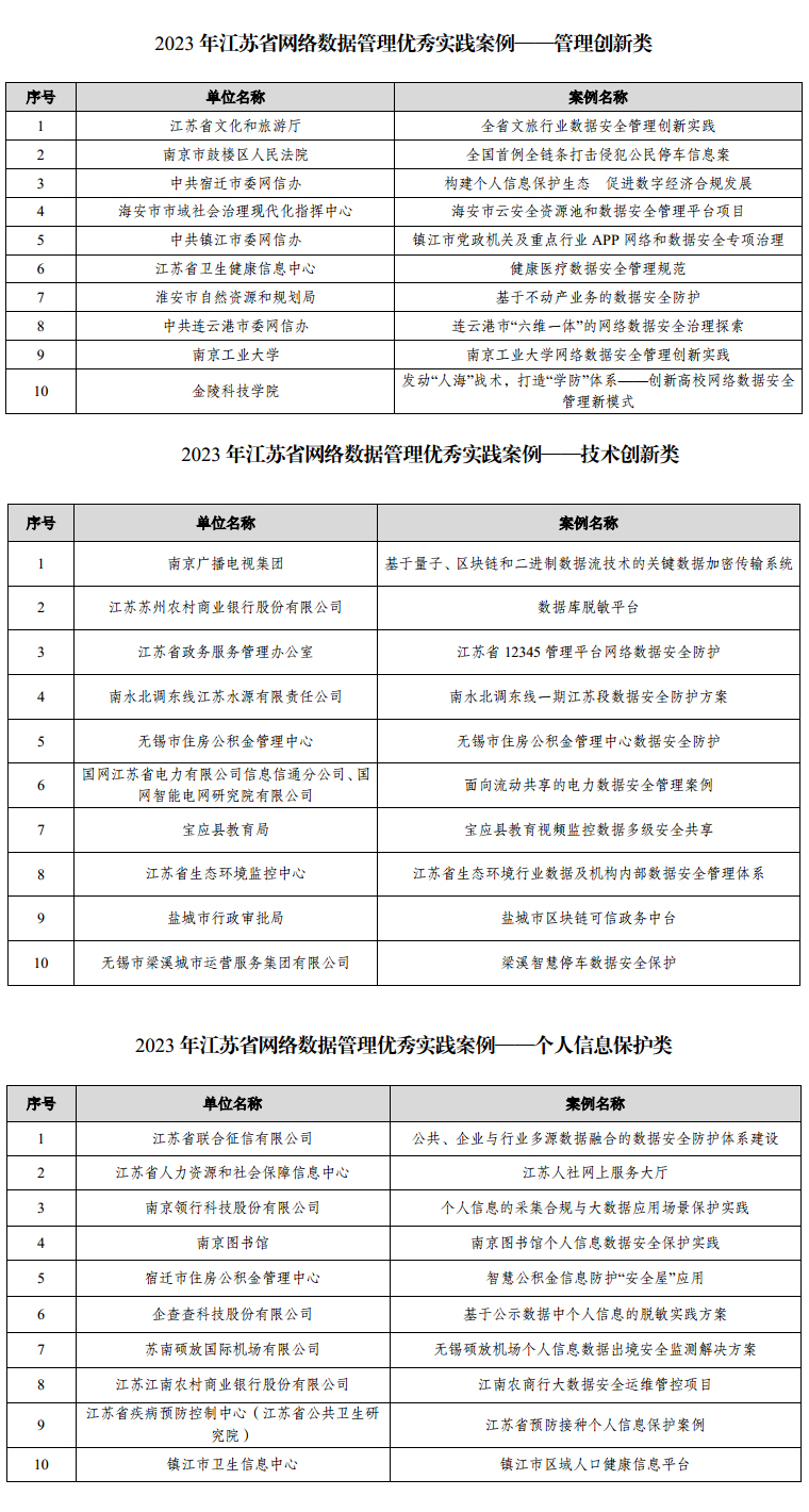 為強(qiáng)化示范引領(lǐng),推動(dòng)我省黨政機(jī)關(guān)、企事業(yè)單位增強(qiáng)數(shù)據(jù)安全意識(shí)和能力,省委網(wǎng)信辦組織開(kāi)展了2023年江蘇省網(wǎng)絡(luò)數(shù)據(jù)管理優(yōu)秀實(shí)踐案例征集活動(dòng)。經(jīng)各地各有關(guān)部門(mén)推薦和專家評(píng)審,遴選出30個(gè)實(shí)踐案例?,F(xiàn)將擬入選2023年江蘇省網(wǎng)絡(luò)數(shù)據(jù)管理優(yōu)秀實(shí)踐案例名單進(jìn)行公示。