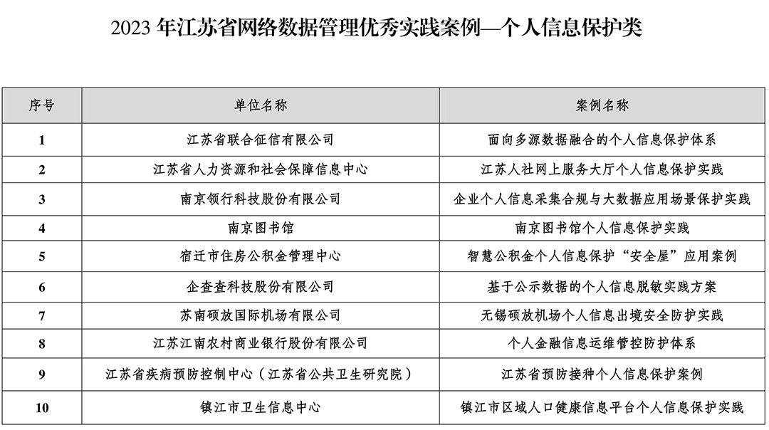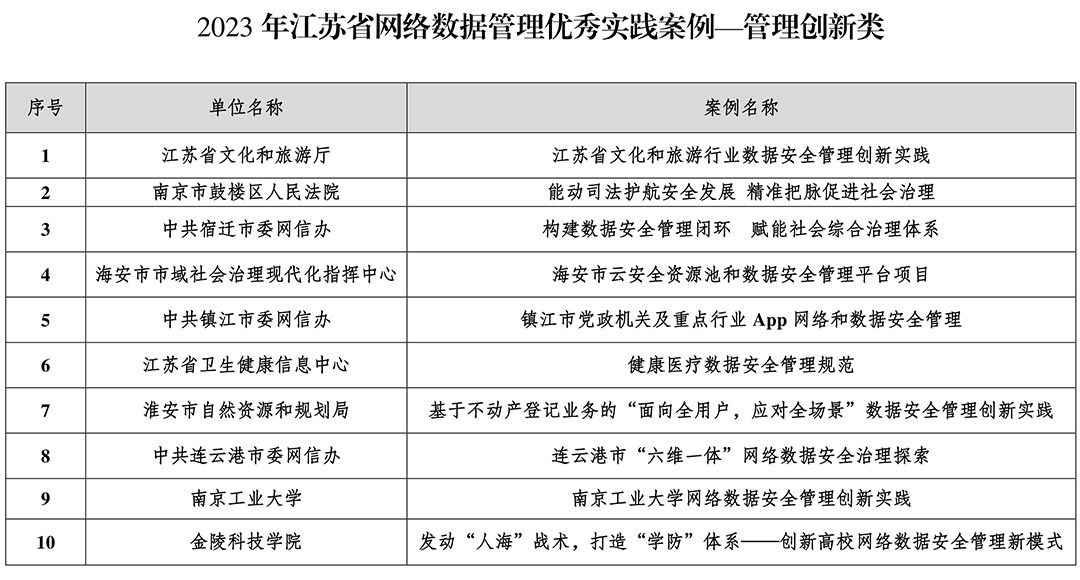 為貫徹落實(shí)《數(shù)據(jù)安全法》《個(gè)人信息保護(hù)法》,強(qiáng)化示范引領(lǐng),推動(dòng)我省黨政機(jī)關(guān)、企事業(yè)單位提高數(shù)據(jù)安全意識(shí)和能力,省委網(wǎng)信辦組織開展2023年江蘇省網(wǎng)絡(luò)數(shù)據(jù)管理優(yōu)秀實(shí)踐案例征集活動(dòng),活動(dòng)得到全社會(huì)的廣泛關(guān)注,共征集293個(gè)申報(bào)案例,經(jīng)過設(shè)區(qū)市篩選推薦、材料審核、現(xiàn)場(chǎng)答辯、專家復(fù)審、公示等多個(gè)環(huán)節(jié),最終評(píng)選出網(wǎng)絡(luò)數(shù)據(jù)安全管理創(chuàng)新、技術(shù)創(chuàng)新和個(gè)人信息保護(hù)三類優(yōu)秀實(shí)踐案例各10個(gè),現(xiàn)予以公布。