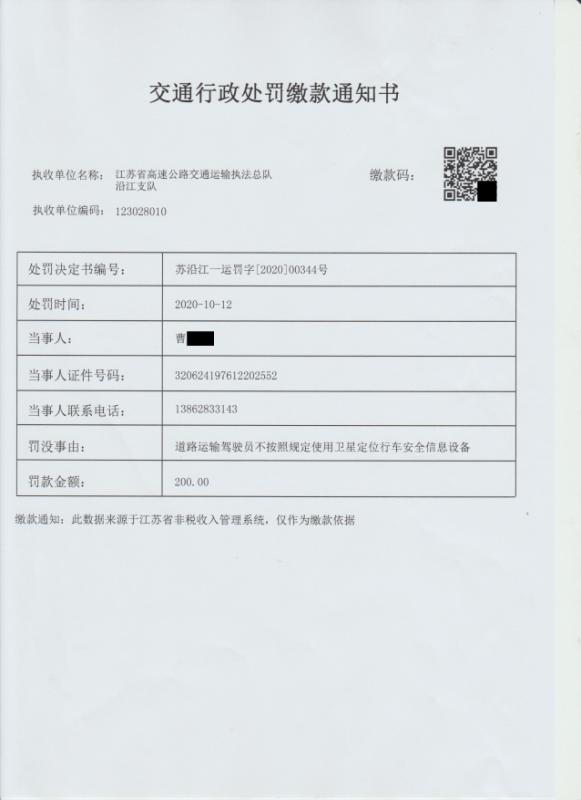 10月12日上午,曹某違反《江蘇省道路運(yùn)輸條例》第二十一條規(guī)定“道路運(yùn)輸駕駛員不按照規(guī)定使用衛(wèi)星定位行車(chē)安全信息設(shè)備”,在沿江支隊(duì)第一大隊(duì)執(zhí)法服務(wù)中心通過(guò)微信掃碼的方式,成功繳納行政處罰款。