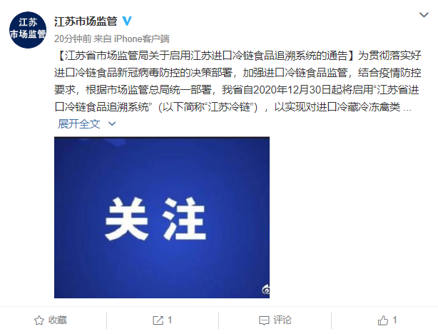 為貫徹落實好進口冷鏈?zhǔn)称沸鹿诓《痉揽氐臎Q策部署,加強進口冷鏈?zhǔn)称繁O(jiān)管,結(jié)合疫情防控要求,根據(jù)市場監(jiān)管總局統(tǒng)一部署,江蘇自2020年12月30日起將啟用“江蘇省進口冷鏈?zhǔn)称纷匪菹到y(tǒng)”(以下簡稱“江蘇冷鏈”),以實現(xiàn)對進口冷藏冷凍禽類、畜類、水產(chǎn)品的追溯管理?,F(xiàn)就有關(guān)事項通告如下。