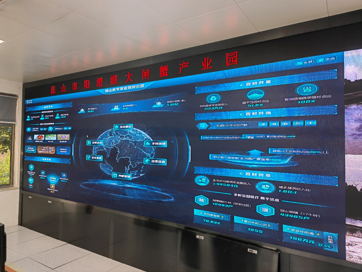 驅(qū)車十分鐘,便可來(lái)到位于隔壁龍?zhí)洞宓睦ド匠魏箝l蟹產(chǎn)業(yè)園辦公室,在中控室巨大的屏幕上,昆山各個(gè)蟹塘的實(shí)時(shí)場(chǎng)景盡收眼底。