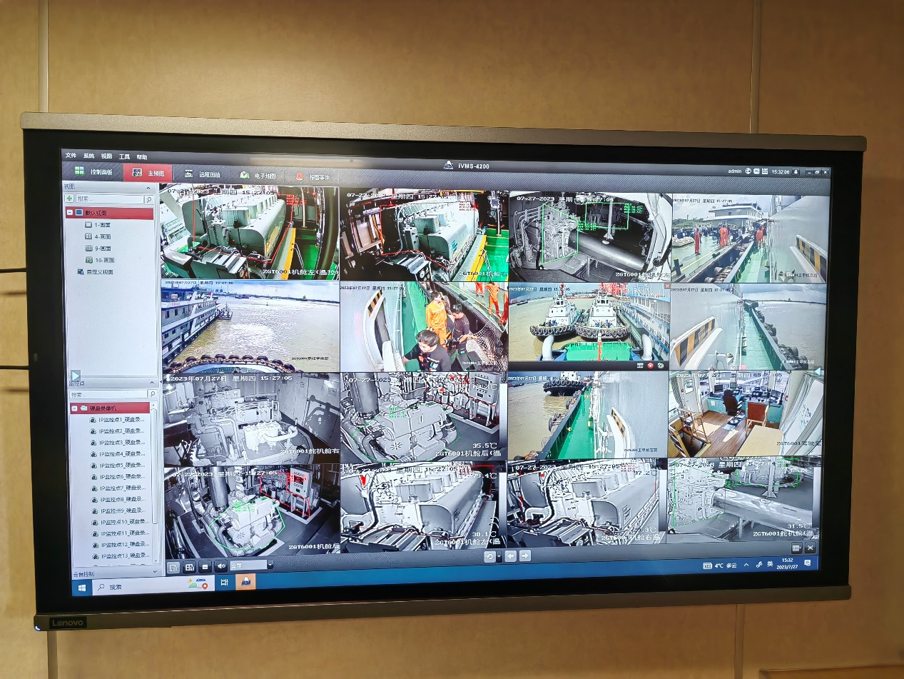 在機(jī)艙會(huì)議室內(nèi)的船舶管理系統(tǒng)大屏幕上,顯示著全船的16個(gè)空間畫(huà)面,溫度參數(shù)等在畫(huà)面可以實(shí)時(shí)顯示?!斑@些都是可感溫監(jiān)控?cái)z像頭,一旦溫度過(guò)高會(huì)實(shí)時(shí)報(bào)警?!辨?zhèn)江港務(wù)集團(tuán)輪駁分公司設(shè)備經(jīng)理冀鵬介紹說(shuō)。下午4:48,記者看到,機(jī)艙室的溫度顯示為44℃,船員笑稱,“這是正常溫度,以前每次下機(jī)艙都是一身汗,現(xiàn)在不用遭罪了。”