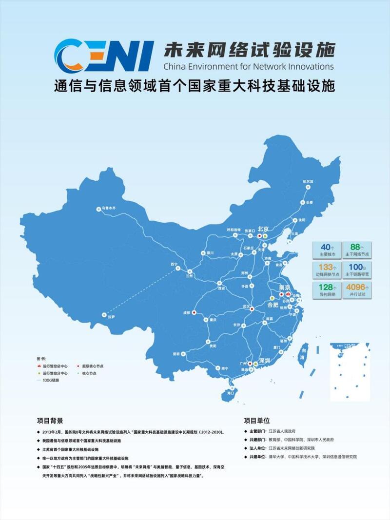 隨后,CENI在國(guó)家的高度重視下穩(wěn)步推進(jìn)。2013年,國(guó)務(wù)院發(fā)布《國(guó)家重大科技基礎(chǔ)設(shè)施建設(shè)中長(zhǎng)期規(guī)劃(2012—2030年)》,CENI作為通信與信息領(lǐng)域的關(guān)鍵項(xiàng)目,被列為優(yōu)先安排建設(shè)的16項(xiàng)重大科技基礎(chǔ)設(shè)施之一,正式踏上了從藍(lán)圖走向現(xiàn)實(shí)的建設(shè)之路。2015年,CENI確定主管部門及共建單位;2016年,CENI項(xiàng)目建議書獲國(guó)家發(fā)展改革委批復(fù);2019年5月,CENI首批12個(gè)光傳輸節(jié)點(diǎn)在北京、南京、廣州、深圳等城市開通運(yùn)行,初步構(gòu)建起網(wǎng)絡(luò)的雛形,搭建起了未來網(wǎng)絡(luò)大廈的框架。