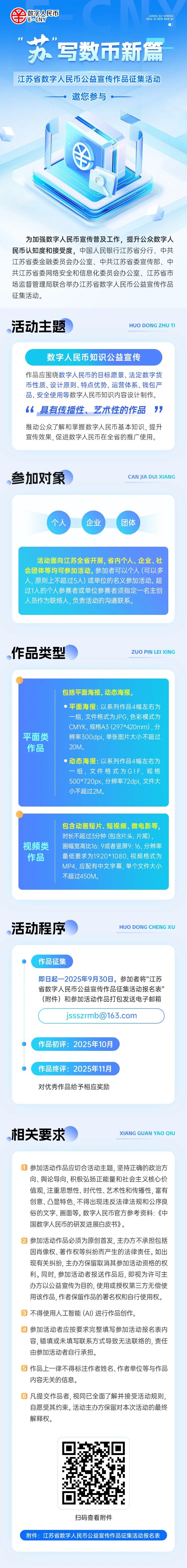 “蘇”寫(xiě)數(shù)幣新篇|江蘇省數(shù)字人民幣公益宣傳作品征集活動(dòng)邀您參與!