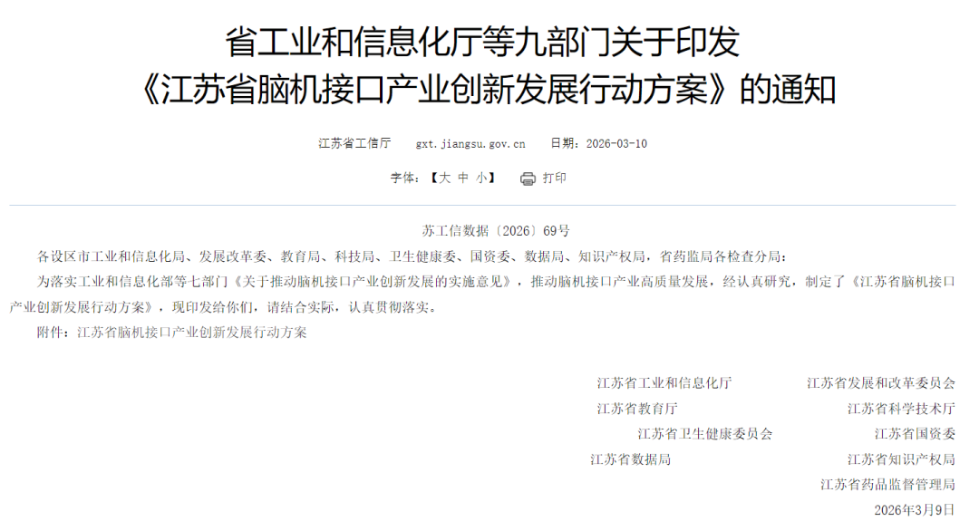 3月10日,江蘇省工業(yè)和信息化廳等部門印發(fā)《江蘇省腦機(jī)接口產(chǎn)業(yè)創(chuàng)新發(fā)展行動(dòng)方案》。方案明確了2027、2030年兩階段總體目標(biāo),圍繞四大核心行動(dòng)部署14項(xiàng)主要任務(wù),并提出組織實(shí)施保障要求,全力推動(dòng)江蘇腦機(jī)接口產(chǎn)業(yè)創(chuàng)新發(fā)展,賦能新型工業(yè)化、支撐現(xiàn)代化產(chǎn)業(yè)體系建設(shè)。