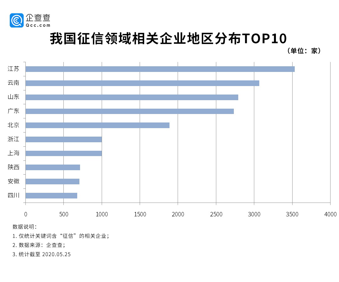 按征信領(lǐng)域相關(guān)企業(yè)地區(qū)分布來看,江蘇省絕對是我國征信領(lǐng)域企業(yè)發(fā)展的“領(lǐng)頭羊”,省內(nèi)超過3500家相關(guān)企業(yè),占全國相關(guān)企業(yè)總量的13.14%。云南、山東緊隨其后,以超過2500家企業(yè)數(shù)量排名第二、第三,分別占全國相關(guān)企業(yè)總量的12.28%和11.17%。