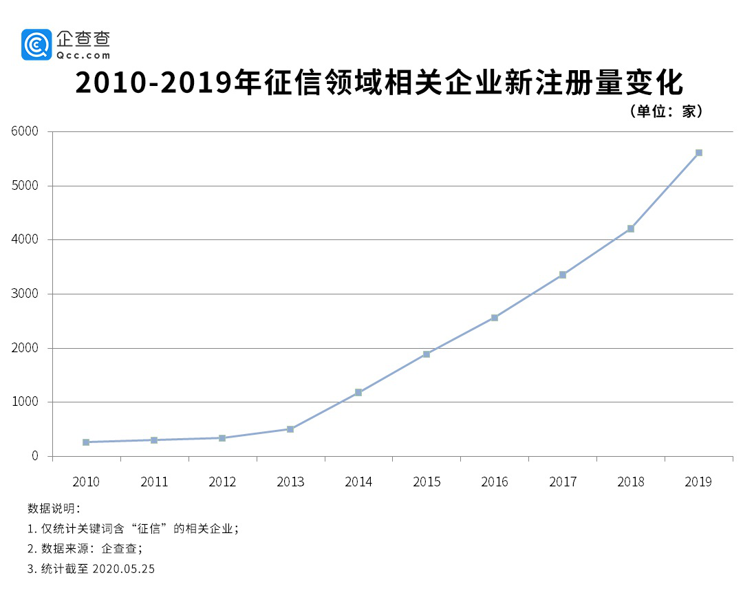2014年是國內(nèi)數(shù)字征信行業(yè)一個(gè)特別的時(shí)間點(diǎn)。企查查截取了2010-2019年征信領(lǐng)域相關(guān)企業(yè)新注冊變化數(shù)據(jù),發(fā)現(xiàn)自2014年開始,征信產(chǎn)業(yè)發(fā)展呈現(xiàn)爆發(fā)式上升趨勢。
