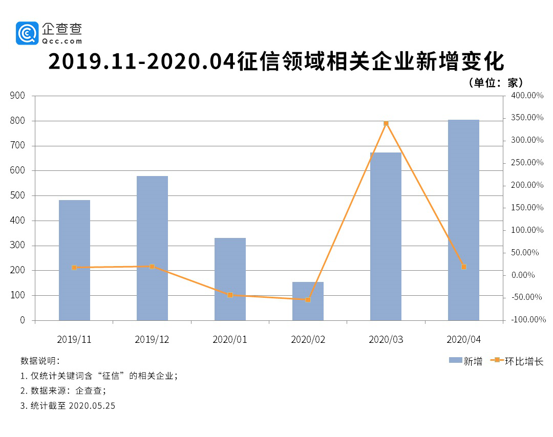 近半年來,征信領(lǐng)域企業(yè)新注冊量不斷攀升,雖然受疫情影響出現(xiàn)過新注冊量大幅下降的情況,但待3月份疫情稍有緩和后,征信領(lǐng)域相關(guān)企業(yè)的新注冊量又開始回升,與前期2月相比環(huán)比增長339%,到4月,征信相關(guān)企業(yè)依舊增勢不減,環(huán)比上月增長19.64%。