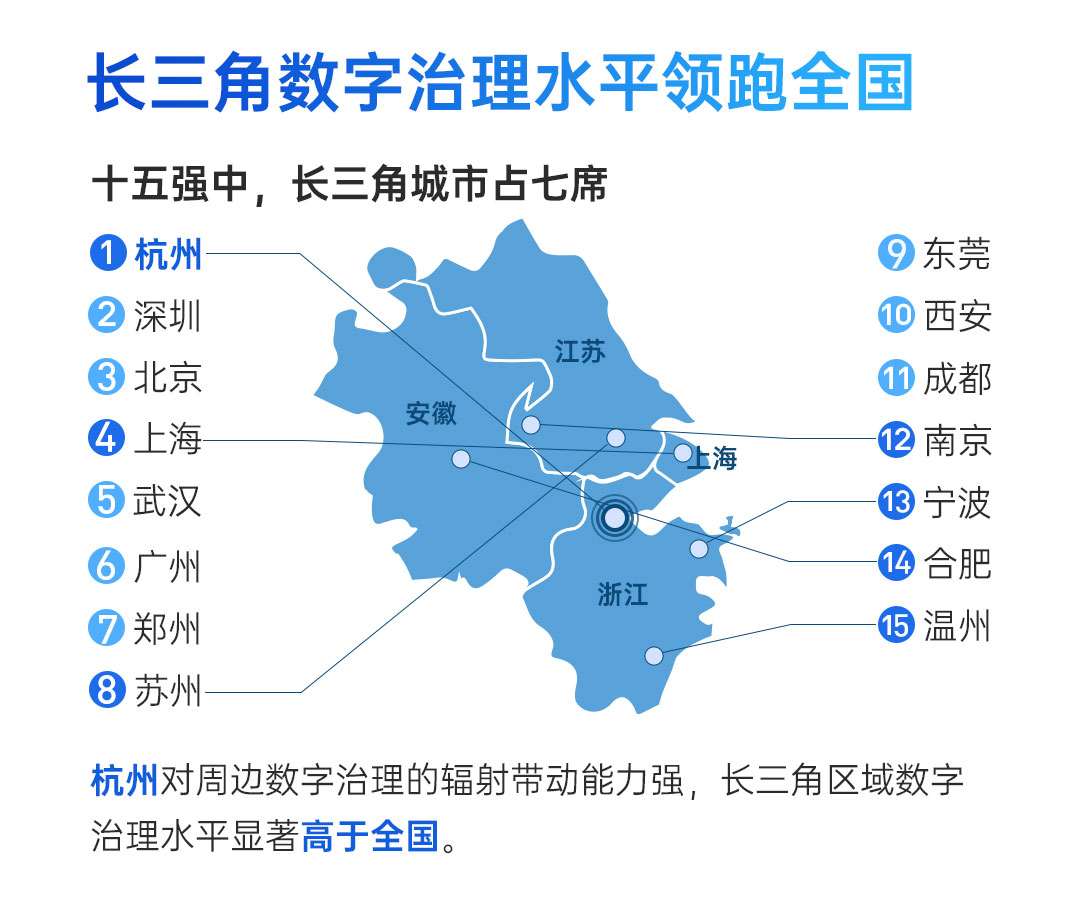 依托阿里巴巴等頭部互聯(lián)網(wǎng)企業(yè),杭州在數(shù)字發(fā)展上一直走在全國(guó)前列,不僅是全國(guó)最早實(shí)現(xiàn)“掃碼乘車”、電子社??ㄈ鞒叹歪t(yī)的城市,還擁有全國(guó)首個(gè)城市大腦、首家跨境電子商務(wù)綜合試驗(yàn)區(qū)等。從杭州走出的健康碼、消費(fèi)券等數(shù)字化工具從華東擴(kuò)展至全國(guó),為數(shù)字化抗疫作出了巨大貢獻(xiàn)。2020年6月,杭州市政府與阿里巴巴簽署深化合作協(xié)議,宣布加快建設(shè)“全國(guó)數(shù)字治理第一城”。與此同時(shí),隨著數(shù)字治理時(shí)代的到來,使得城市之間在競(jìng)爭(zhēng)之外,也有了更多協(xié)同的可能。報(bào)告顯示,杭州的周邊輻射帶動(dòng)能力強(qiáng),長(zhǎng)三角區(qū)域數(shù)字治理水平顯著高于全國(guó)。南京、寧波、合肥、溫州、湖州、金華、無錫、嘉興、紹興等長(zhǎng)三角城市均位于全國(guó)城市數(shù)字治理前列。地鐵互聯(lián)互通、長(zhǎng)三角一網(wǎng)通辦等創(chuàng)新項(xiàng)目最早在長(zhǎng)三角落地生根。