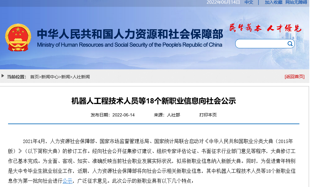6月14日,人力資源和社會(huì)保障部官網(wǎng)發(fā)布《機(jī)器人工程技術(shù)人員等18個(gè)新職業(yè)信息向社會(huì)公示》,公示全文如下:機(jī)器人工程技術(shù)人員等18個(gè)新職業(yè)信息向社會(huì)公示2021年4月,人力資源社會(huì)保障部、國(guó)家市場(chǎng)監(jiān)督管理總局、國(guó)家統(tǒng)計(jì)局聯(lián)合啟動(dòng)對(duì)《中華人民共和國(guó)職業(yè)分類大典(2015年版)》(以下簡(jiǎn)稱大典)的修訂工作。經(jīng)向社會(huì)公開征集修訂建議、組織專家評(píng)估論證、書面征求行業(yè)部門意見等程序,大典修訂工作已基本完成。為全面、客觀、如實(shí)、準(zhǔn)確反映當(dāng)前社會(huì)職業(yè)發(fā)展實(shí)際狀況,擬將新職業(yè)信息納入新版大典。同時(shí),為促進(jìn)青年特別是大中專畢業(yè)生就業(yè)創(chuàng)業(yè)工作,近期,人力資源社會(huì)保障部將向社會(huì)公示相關(guān)新職業(yè)信息,其中機(jī)器人工程技術(shù)人員等18個(gè)新職業(yè)信息作為第一批向社會(huì)進(jìn)行公示,廣泛征求意見。此次公示的新職業(yè)具有以下幾個(gè)特點(diǎn):