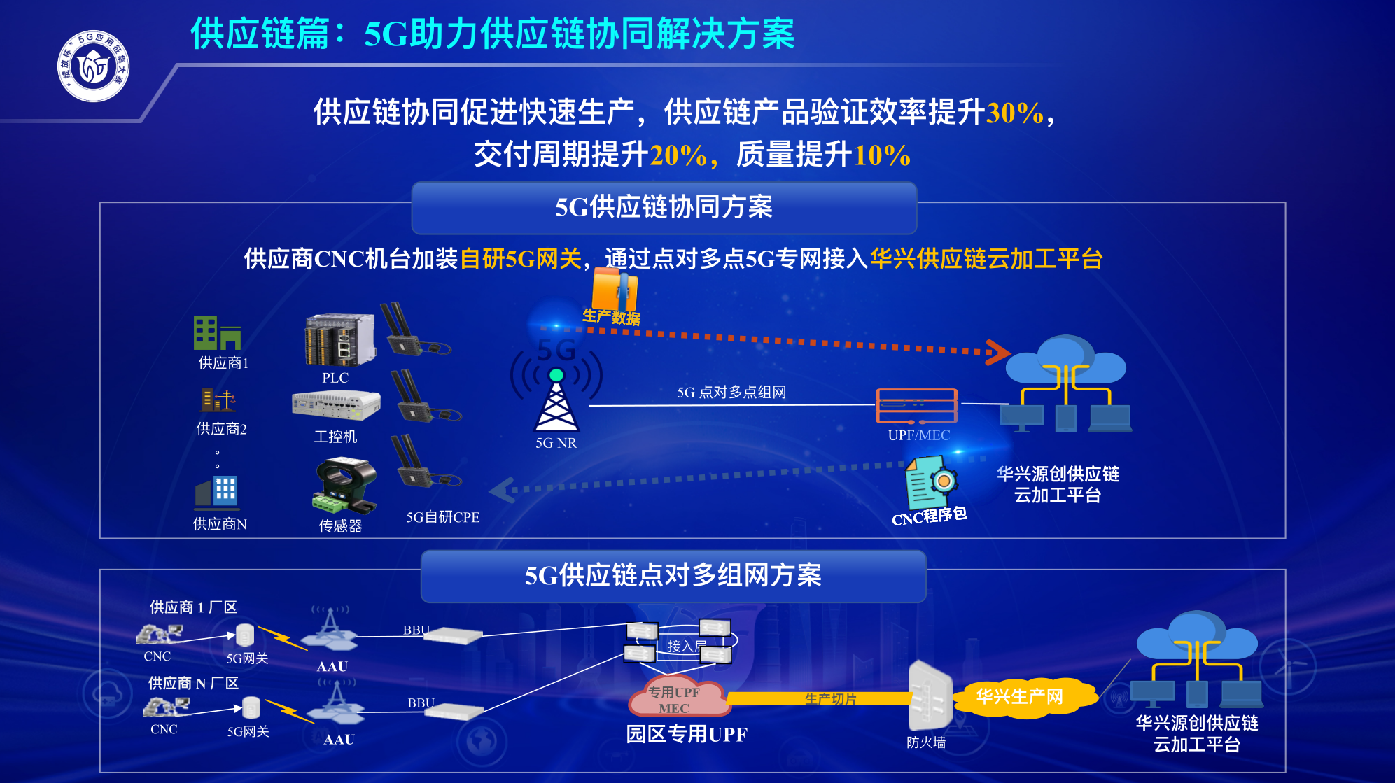 蘇州華興源創(chuàng)科技股份有限公司、蘇州聯(lián)通打造的一個5G 超級數(shù)字工廠項目,獲得二等獎。項目團(tuán)隊成員、蘇州聯(lián)通技術(shù)支撐經(jīng)理杜聰介紹,該項目以5G隨行專網(wǎng)、5G虛擬專網(wǎng)、5G混合專網(wǎng)的“三網(wǎng)融合”,達(dá)成跨廠區(qū)、跨企業(yè)、跨地域數(shù)據(jù)融通的目標(biāo),為研發(fā)協(xié)同、供應(yīng)鏈協(xié)同創(chuàng)造條件。分布在5個城市的研發(fā)中心工作人員,可以隨時隨地接入研發(fā)內(nèi)網(wǎng),無需來回奔波,為檢測技術(shù)彎道超車節(jié)約寶貴時間。供應(yīng)商的生產(chǎn)、設(shè)備狀態(tài)等數(shù)據(jù),可以通過5G專網(wǎng)上傳到華興的供應(yīng)鏈云加工平臺,靈活接入的同時保障核心生產(chǎn)數(shù)據(jù)的安全可靠?!澳壳埃?88家供應(yīng)商中,有39家已接入這個平臺。比賽時評委問,供應(yīng)商為什么愿意接入平臺?”杜聰說,“我們的答案是,供應(yīng)商中有不少中小企業(yè),它們免費使用這個平臺,不僅節(jié)省成本,還能保證訂單量。對5G的應(yīng)用,給了華興與供應(yīng)商共同成長的機(jī)會。”