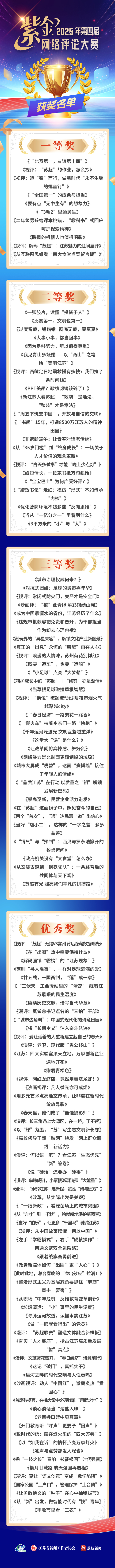 日前,由中共江蘇省委網(wǎng)信辦、江蘇省新聞工作者協(xié)會主辦,省記協(xié)新媒體專委會、各設(shè)區(qū)市市委網(wǎng)信辦、省重點新聞網(wǎng)站承辦,江蘇省廣播電視總臺荔枝新聞執(zhí)行的第四屆紫金網(wǎng)絡(luò)評論大賽結(jié)果正式揭曉。