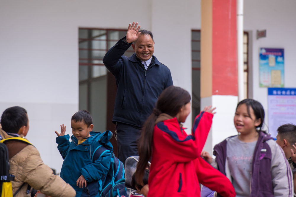 2025年2月18日,在落松地小學(xué),農(nóng)加貴(中)下課后和學(xué)生揮手告別。新華社記者 彭奕凱 攝
