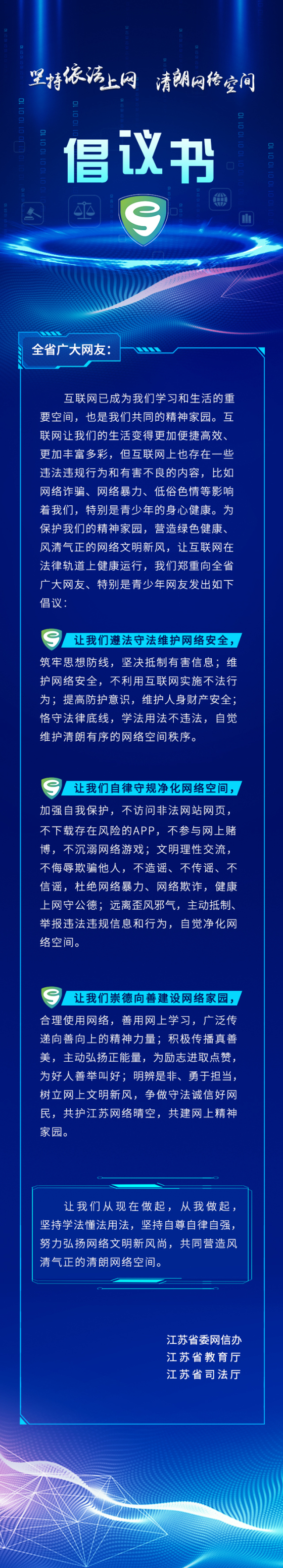 6月1日,《中華人民共和國網(wǎng)絡(luò)安全法》頒布施行三周年,由江蘇省委網(wǎng)信辦、江蘇省教育廳、江蘇省司法廳共同主辦的江蘇省2020年度網(wǎng)信普法活動暨全省“百網(wǎng)百?!薄熬W(wǎng)法融通夢想 護衛(wèi)清朗少年”聯(lián)合普法活動線上啟動。