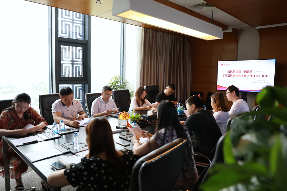 7月17日下午,鹽城市委網(wǎng)信辦在屬地商業(yè)網(wǎng)站鶴鳴亭舉辦《網(wǎng)絡信息內(nèi)容生態(tài)治理規(guī)定》專題輔導,鶴鳴亭全體中層以上干部參加。