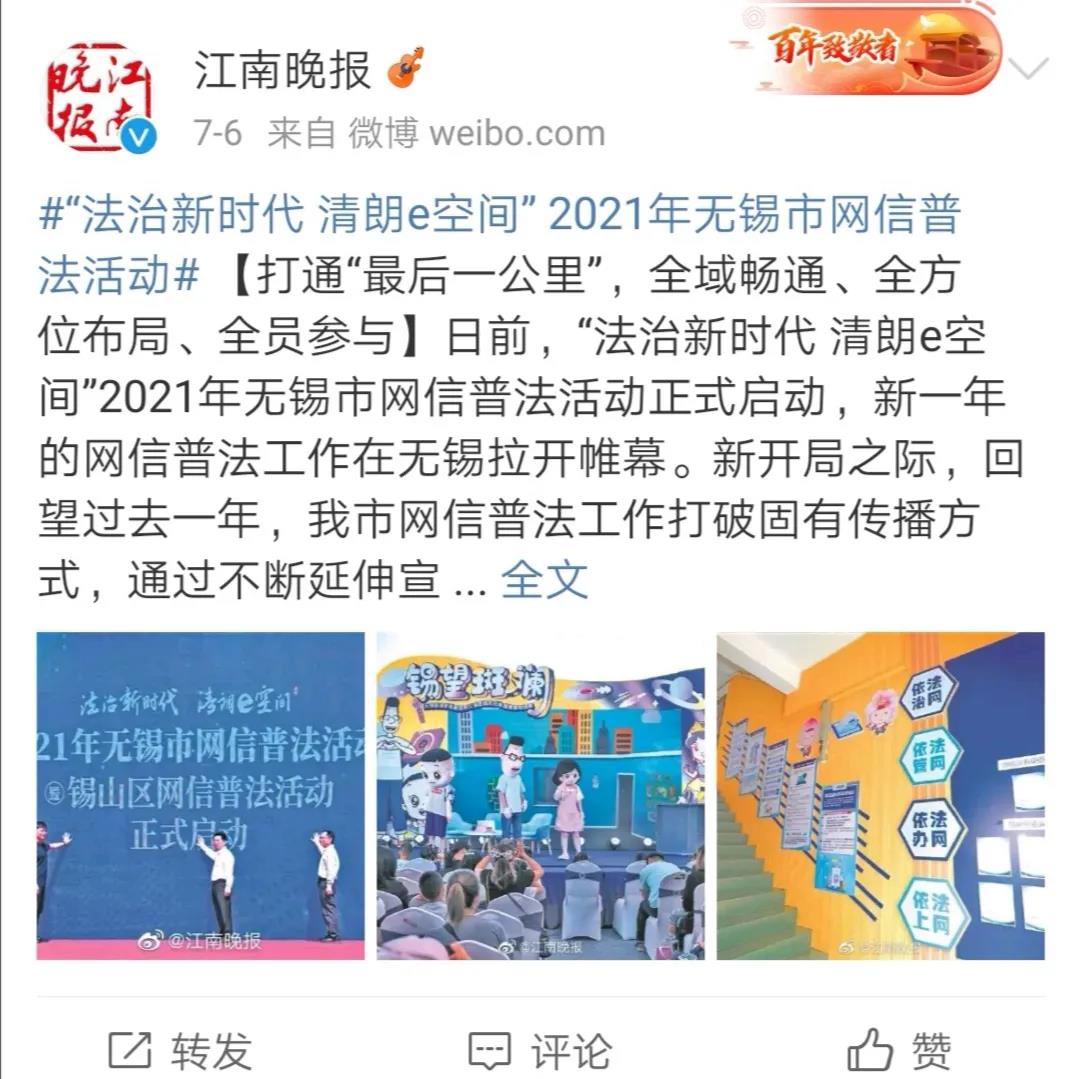 2021年,無錫市委網(wǎng)信辦(市互聯(lián)網(wǎng)信息辦公室)認(rèn)真貫徹落實(shí)《無錫市國家機(jī)關(guān)“誰執(zhí)法誰普法”普法責(zé)任制實(shí)施辦法》,以“法治新時(shí)代 清朗e空間”為主題,緊緊圍繞網(wǎng)信中心工作,健全網(wǎng)絡(luò)普法工作機(jī)制,創(chuàng)新網(wǎng)絡(luò)普法方式方法,發(fā)揮網(wǎng)信普法在推進(jìn)網(wǎng)絡(luò)強(qiáng)國建設(shè)中的重要作用,為慶祝建黨百年?duì)I造了健康向上、風(fēng)清氣正的網(wǎng)絡(luò)環(huán)境。