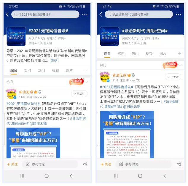 積極運(yùn)用微博、微信、抖音等新媒體平臺,密集報(bào)道、集中推送。微博話題#2021無錫網(wǎng)信普法#已取得511.7萬閱讀量,#法治新時(shí)代 清朗e空間#已取得501.1萬的閱讀量;以網(wǎng)信普法卡通形象“錫小朗”為主角結(jié)合網(wǎng)絡(luò)詐騙、套路貸、網(wǎng)絡(luò)賭博等相關(guān)案例打造普法平面海報(bào)和MG動(dòng)畫。