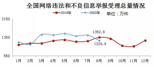 2020年8月,全國各級(jí)網(wǎng)絡(luò)舉報(bào)部門受理舉報(bào)1224.6萬件,環(huán)比下降15.8%、同比下降9.5%。其中,中央網(wǎng)信辦(國家互聯(lián)網(wǎng)信息辦公室)違法和不良信息舉報(bào)中心受理舉報(bào)10.5萬件,環(huán)比增長10.2%、同比下降54.4%;各地網(wǎng)信辦舉報(bào)部門受理舉報(bào)141.4萬件,環(huán)比下降3.0%、同比下降18.2%;全國主要網(wǎng)站受理舉報(bào)1072.7萬件,環(huán)比下降17.5%,同比下降7.3%。