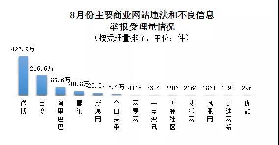 在全國主要網(wǎng)站受理的舉報(bào)中,微博、百度、阿里巴巴、騰訊、新浪網(wǎng)、今日頭條等主要商業(yè)網(wǎng)站受理量占75.1%,達(dá)805.2萬件。
