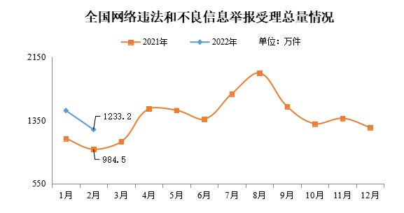 2022年2月,全國各級網(wǎng)絡(luò)舉報(bào)部門受理舉報(bào)1233.2萬件,環(huán)比下降16.3%、同比增長25.3%。其中,中央網(wǎng)信辦(國家互聯(lián)網(wǎng)信息辦公室)違法和不良信息舉報(bào)中心受理舉報(bào)31.7萬件,環(huán)比下降13.1%、同比增長68.2%;各地網(wǎng)信辦舉報(bào)部門受理舉報(bào)75.9萬件,環(huán)比下降22.6%、同比下降15.9%;全國主要網(wǎng)站受理舉報(bào)1125.5萬件,環(huán)比下降16.0%、同比增長28.6%。在全國主要網(wǎng)站受理的舉報(bào)中,主要商業(yè)網(wǎng)站受理量占63.9%,達(dá)718.7萬件。