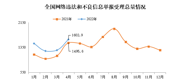 2022年4月,全國各級網(wǎng)絡(luò)舉報部門受理舉報1602.9萬件,環(huán)比增長27.4%、同比增長7.2%。其中,中央網(wǎng)信辦(國家互聯(lián)網(wǎng)信息辦公室)違法和不良信息舉報中心受理舉報50.6萬件,環(huán)比增長36.0%、同比增長164.7%;各地網(wǎng)信辦舉報部門受理舉報80.6萬件,環(huán)比下降4.4%、同比下降23.9%;全國主要網(wǎng)站受理舉報1471.8萬件,環(huán)比增長29.4%、同比增長7.4%。