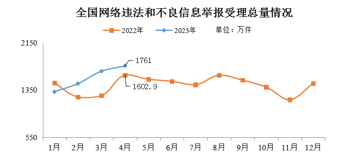 2023年4月,中央網(wǎng)信辦舉報(bào)中心指導(dǎo)全國(guó)各級(jí)網(wǎng)信舉報(bào)工作部門、主要網(wǎng)站平臺(tái)受理網(wǎng)民舉報(bào)色情、賭博、侵權(quán)、謠言等違法和不良信息1761萬(wàn)件,環(huán)比增長(zhǎng)5.4%、同比增長(zhǎng)9.9%。其中,中央網(wǎng)信辦舉報(bào)中心受理舉報(bào)74.2萬(wàn)件,環(huán)比增長(zhǎng)67.5%、同比增長(zhǎng)46.7%;各地網(wǎng)信舉報(bào)工作部門受理舉報(bào)49.7萬(wàn)件,環(huán)比下降32.8%、同比下降38.3%;全國(guó)主要網(wǎng)站平臺(tái)受理舉報(bào)1637.1萬(wàn)件,環(huán)比增長(zhǎng)5.5%、同比增長(zhǎng)11.2%。